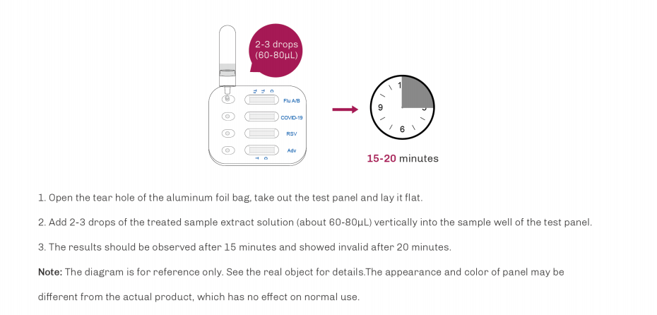 The SARS-CoV-2/Flu A+B/AdV/RSV Antigen Rapid Test is intended for in vitroqualitative detection to severe acute respiratory syndrome coronavirus 2 (SARS-CoV-2)antigen,influenza A+B (Flu A+B) antigen, respiratory adenovirus (AdV)antigen and respiratory syncytial virus (RSV)antigen in humannasopharyngeal swab or oropharyngeal swab samples.